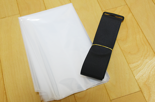 1. 集荷キットに、梱包用ビニール(左)、結束ベルト(右)が入っている事をご確認ください。