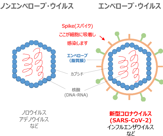 今回の新型コロナウイルスやインフルエンザウイルスはRNAタイプでエンベロープウイルスに属します。