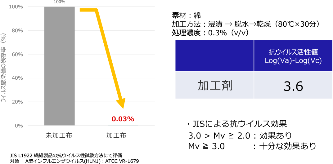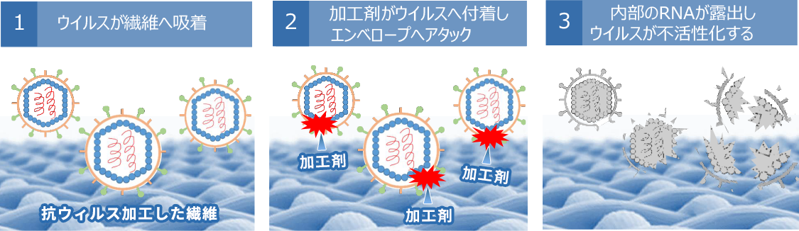 加工剤が繊維に付着したウイルスのエンベロープに作用することで、 ウイルスの数を減少させます。