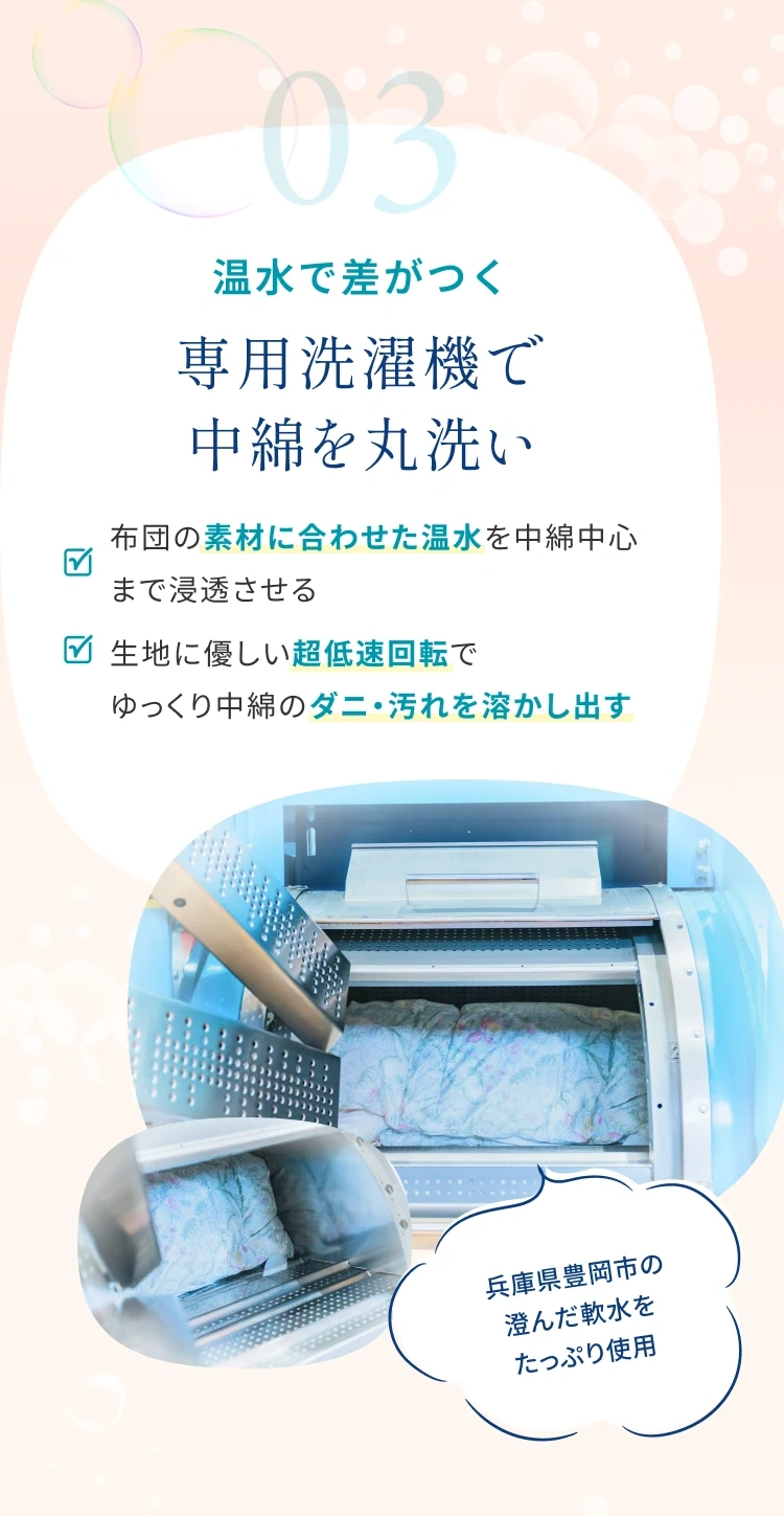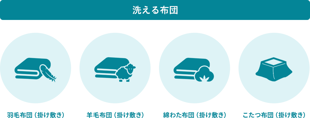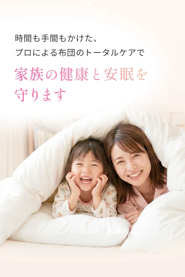 羽毛布団・羊毛布団・綿わた布団すべての素材に対応します。敷布団・掛布団に加え、こたつ布団・座布団・ベビー布団から毛布・タオルケットも取り扱っています。