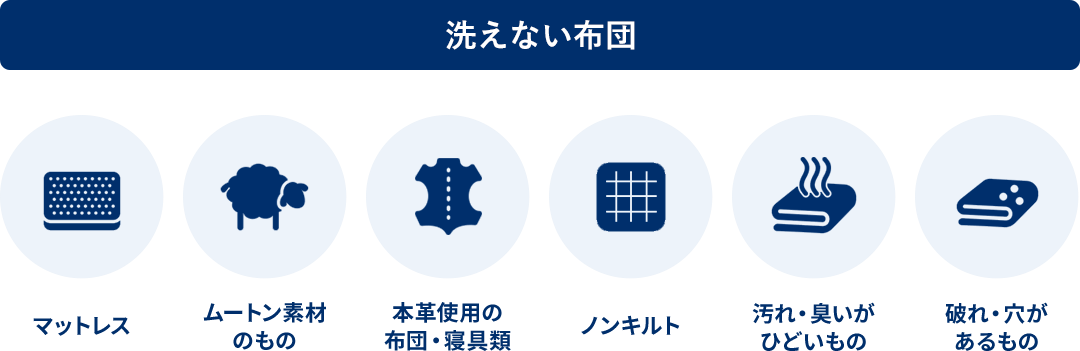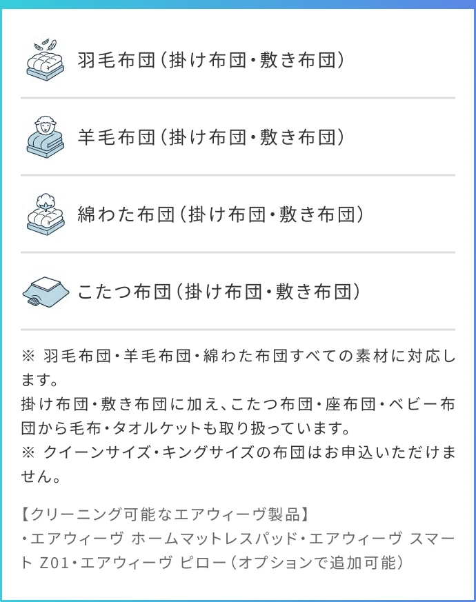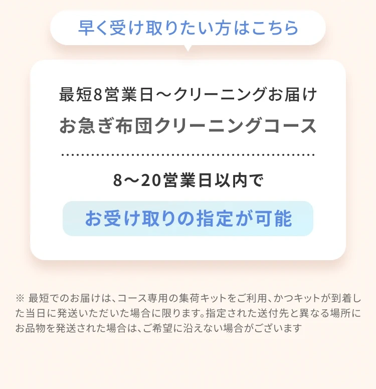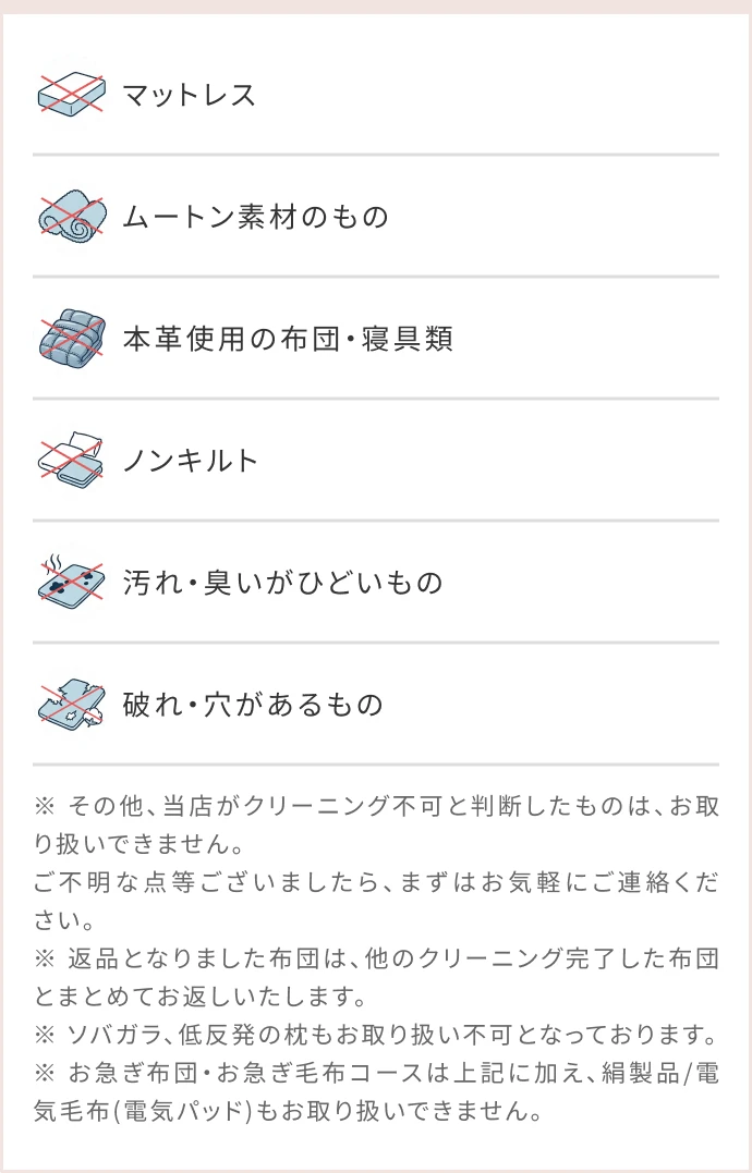※ お急ぎ布団・お急ぎ毛布コースは上記に加え、絹製品/電気毛布(電気パッド)もお取り扱い出来ません。