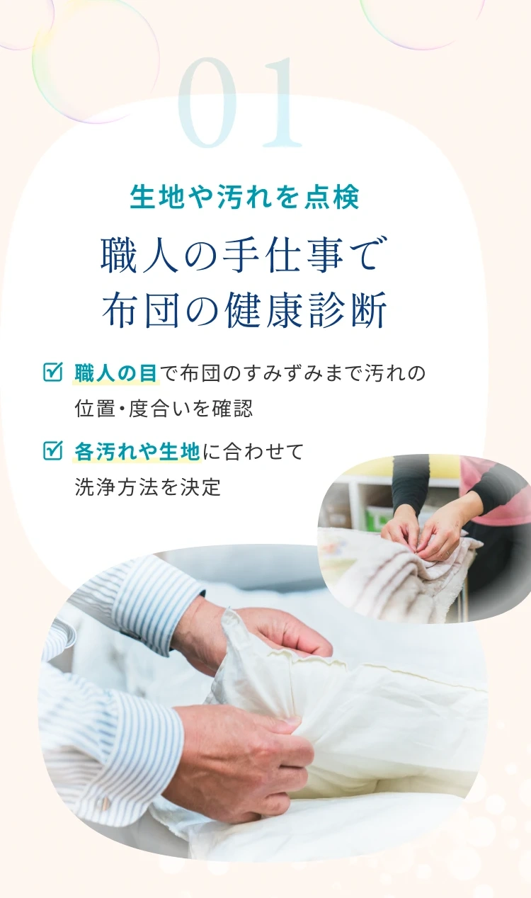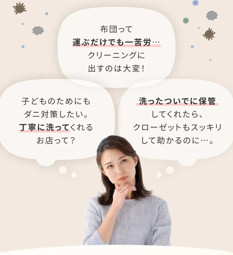 その他、当店がクリーニング不可と判断したものは、お取り扱いできません。 布団クリーニングに関しまして、気になることやご不明な点等ございましたら、まずはお気軽に当店までご連絡ください。